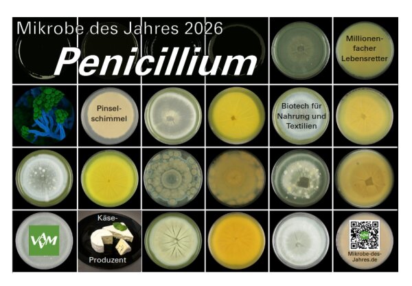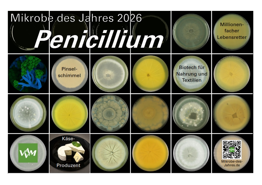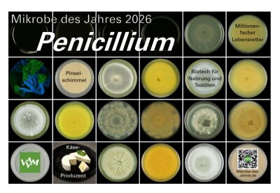 Der Schimmelpilz Penicillium ist von der Vereinigung für Allgemeine und Angewandte Mikrobiologie (VAAM) zur Mikrobe des Jahres 2026 gewählt worden. Mit der Auszeichnung würdigt die Fachjury die außergewöhnliche Bedeutung des Pilzes für Medizin, Lebensmittelproduktion und Biotechnologie.